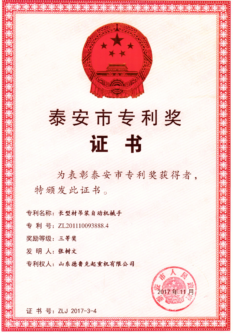 泰安市专利奖证书